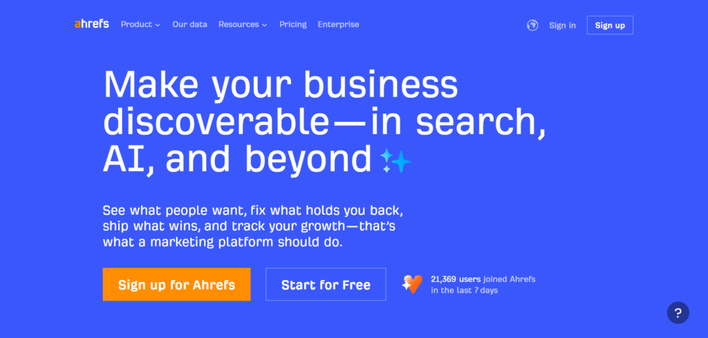 Ahrefs is a powerful SEO and marketing platform that helps you discover what people are searching for, fix what’s holding your website back, and create content that truly ranks. With tools for keyword research, backlink analysis, competitor tracking and website audits, it gives you clear data to grow your traffic and own your niche. Whether you’re checking who links to you, finding high-value keywords or spotting content gaps your rivals are missing, Ahrefs makes it simpler to act and win.