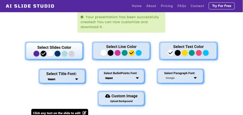 AI Slide Studio is a very fast and easy tool for making slides, but it has some limits. The AI creates presentations quickly, which is great if you need something fast. The designs are simple and clean, and you can change colors, fonts, and images to make it look better. But, the AI sometimes adds basic or not-so-useful content, so you might need to edit a lot before using the slides. Also, the free plan does not let you download presentations, which can be frustrating. It’s a good tool for quick ideas, but for a perfect presentation, you still need to edit and improve the slides yourself.