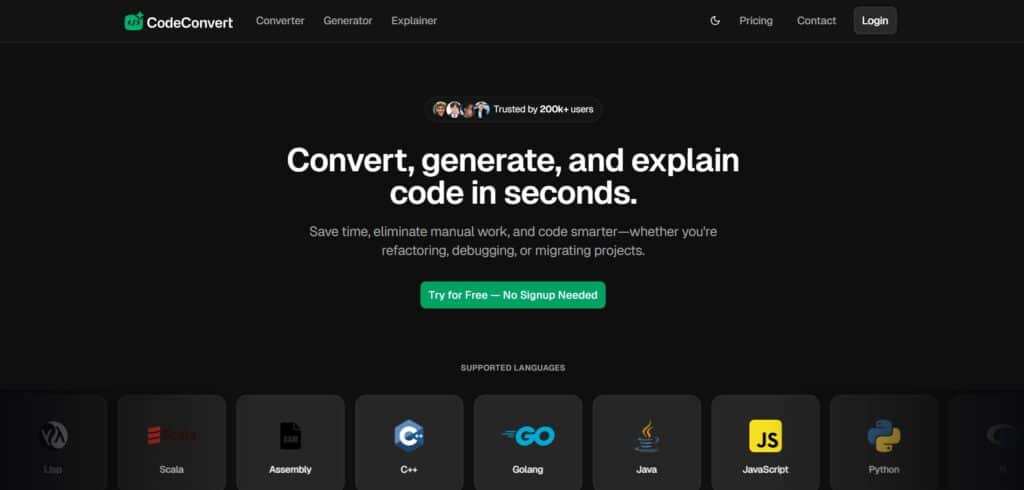I tried CodeConvert AI after using many other coding tools, and it does a pretty good job with fast code conversion and easy explanations. It supports so many languages, which is helpful, and I liked that I didn’t need to sign up to test it. But sometimes, the converted code needs small fixes, especially with tricky logic or comments. The interface is clean, but the performance can slow down when handling long code files. Overall, it’s useful and saves time, but it’s not perfect and still needs manual checking if you want really clean, ready-to-use code.
