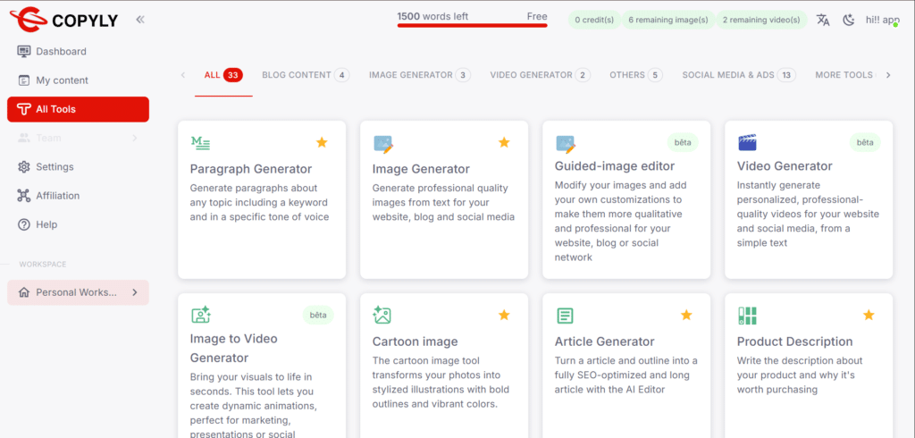 After trying Copyly, I think it’s a very fast and helpful tool for writing many kinds of content like ads, blogs, and social media posts. It’s easy to use, and the templates save a lot of time. The grammar check and SEO tools work well too. But sometimes the content feels a bit too general or robotic, especially when you don’t give many details. Also, the image and video limits in lower plans can be a bit small if you use it a lot. Still, for the price and speed, it’s a good option if you know how to edit the AI's work and add your own voice.