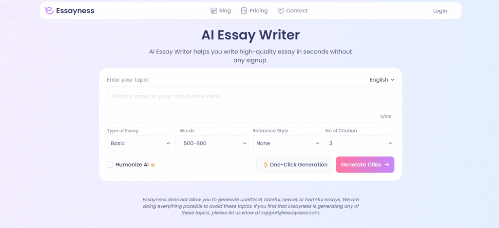 After using Essayness, I think it is a very fast and easy tool for writing essays, especially for people who don’t know where to start. I liked that it can make essays in a few seconds and the Humanize AI option makes the writing feel a bit more natural. It is also good that you can choose different essay types and word lengths. But I noticed that sometimes the essays are a little basic and not very deep. Some parts feel like they are repeated or not very detailed. Also, the free version is a bit limited because the Humanize AI and longer essays need payment. Overall, it is a helpful tool, but you still need to check the work carefully and maybe add your own ideas to make it really good.