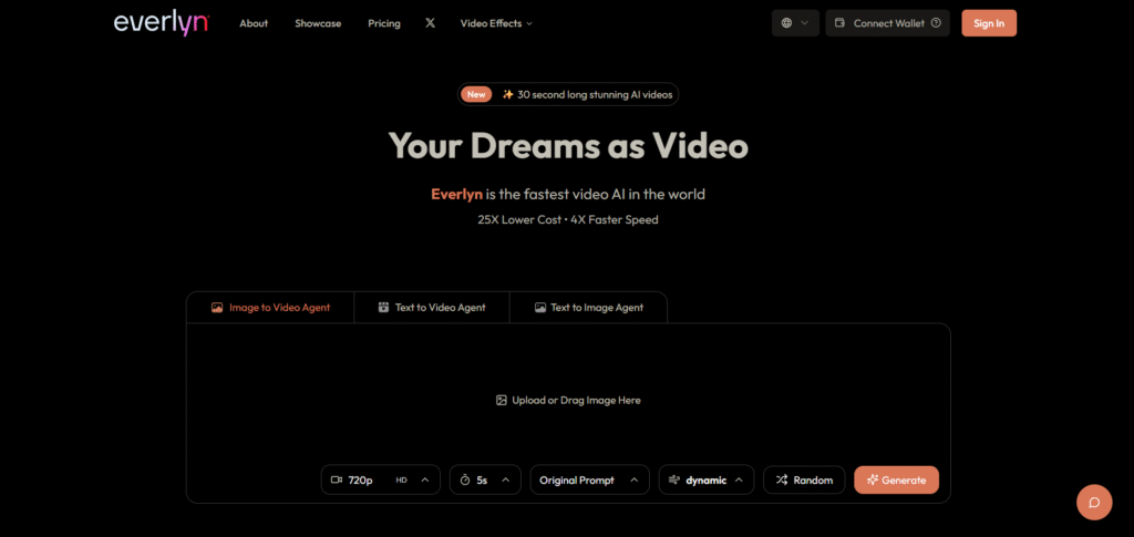 Everlyn is a super fast and smart AI tool that turns your dreams into videos in just 15 seconds much quicker and cheaper than other tools! You can create stunning 30-second videos from images or text, and even generate cool images with simple prompts. It works 25 times cheaper and 4 times faster, making it great for anyone who wants to make creative content quickly. Everlyn uses breakthrough technology to help people make amazing videos without waiting or paying too much. Just upload a picture or write an idea, and Everlyn brings it to life fast, easy, and fun!