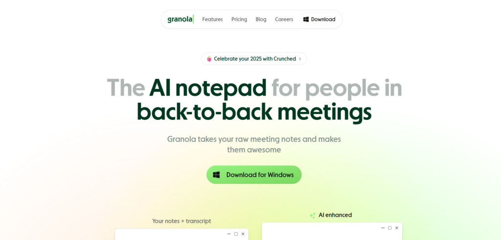 Granola is an AI notepad for people in back-to-back meetings: you jot quick notes your way, and then it enhances your notes in seconds using the transcript, so you get clean, shareable meeting summaries without extra work. The coolest part is no meeting bots Granola does not “join” the call; it listens from your device by using your system audio and mic for transcription. It’s also built with privacy in mind: no stored recordings on desktop (it keeps only the transcript and the notes you add), and your notes stay private unless you choose to share them. You can also use templates so your notes come out in the format you like, and there’s a free Basic plan if you just want to try it.