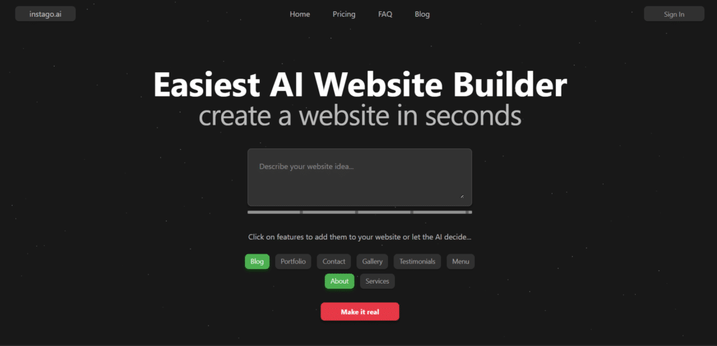 I tried Instago AI after using other website builders, and it was very fast and easy to start. The AI made a full website for me in seconds, with text and pictures that were pretty good. I liked that I didn’t need to think much or write everything myself. But some parts were not perfect — the design choices were a bit basic, and changing things like layout or colors felt limited unless you know some code. Also, some features like e-commerce were not ready yet. It's a good tool for quick websites, but it still needs some work if you want more control or something really unique.