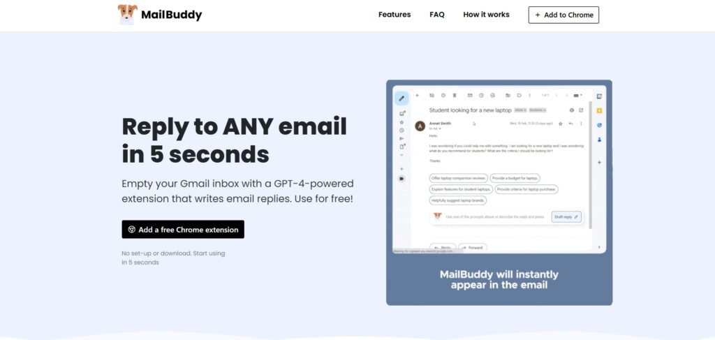 MailBuddy AI is a free Chrome extension that helps you reply to any email in just 5 seconds! Powered by GPT-4, it reads your emails and writes responses instantly, saving you time and effort. No setup or extra logins just install and start using it right inside Gmail. You can even customize the tone make it polite, funny, formal, or short just tell MailBuddy what you need! Plus, it never collects your personal data, so it’s safe and private. Whether it’s inquiries, follow-ups, or corporate emails, MailBuddy handles it all, so you can focus on what really matters. Try it for free today!