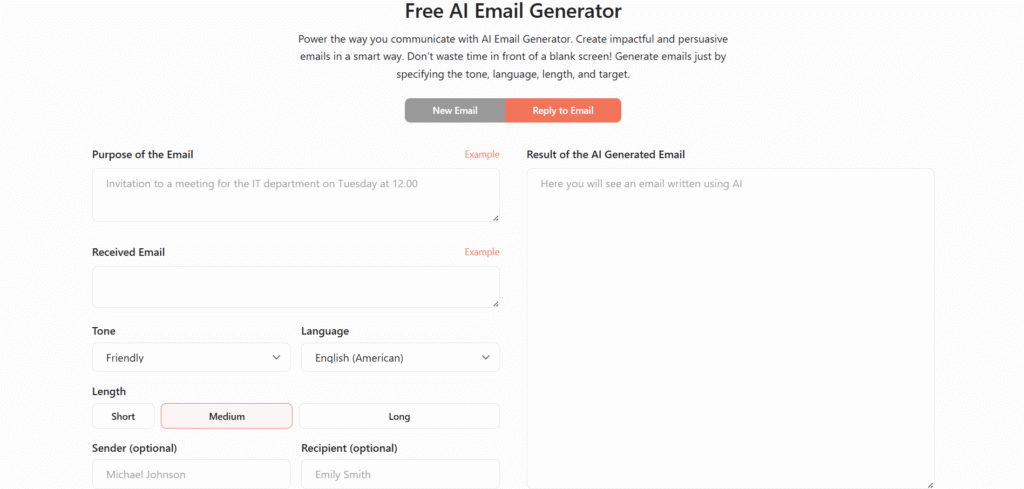 MailGenerator.ai is a free online AI email writer that helps you write smart and powerful emails in just a few clicks. You simply choose the tone, language, length, and write your email purpose like inviting someone to a meeting and the tool creates a great email for you! Whether you’re writing a new message or replying to one, it makes your emails more personal, clear, and interesting. It’s easy to use, works fast, and supports many languages. Best of all, it’s completely free, with no hidden costs. You can even use it on your phone, and everything stays private and secure.