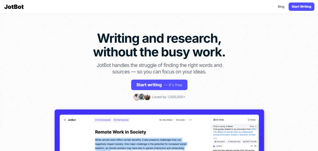 JotBot (myjotbot.com) is a friendly AI writing and research tool that works like a simple online document editor: it helps you beat writer’s block with AI Autocomplete, lets you find and cite sources without leaving the page, can generate drafts in your voice, and even lets you chat with your sources (PDFs, webpages, and text) to ask questions or get quick summaries; it’s free to start, and the site highlights that it’s “Loved by 1,000,000+” writers, students, teams, and researchers who want to write more, better, and faster.