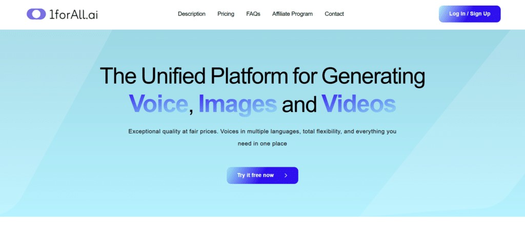 1ForAll AI is a smart and easy-to-use platform that lets you create voices, images, and videos all in one place. It uses top tools like OpenAI, Google, AWS, and more to help you make high-quality content without switching between apps. You can turn text into natural-sounding speech, clone voices in different languages, and even make videos from simple text or images. It’s great for people who want to make content fast—like audio for books, ads, or training. You can also upload a spreadsheet to quickly create hundreds of voice or image files. With pay-as-you-go pricing and no forced subscriptions, it’s flexible, fair, and perfect for both small and big projects.