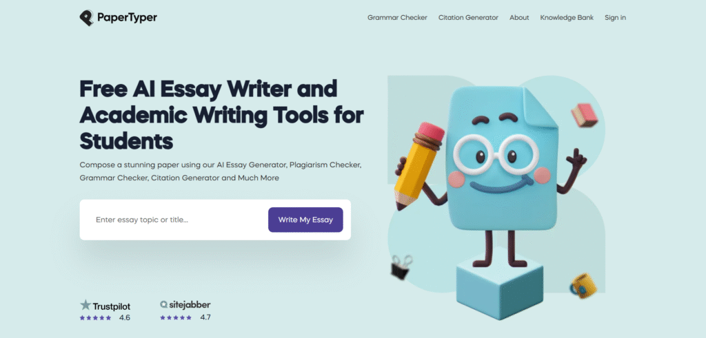 PaperTyper.net is a free online tool that helps students write better and faster. With just a few clicks, you can use the AI Essay Generator to create full essays, check for mistakes using the Grammar Checker, and make sure your writing is original with the Plagiarism Checker. It also has a Citation Generator for easy referencing in styles like APA, MLA, and Chicago. More than 50,000 students use it every month because it’s simple, fast, and made for school work. Whether you need help starting your paper, fixing grammar, or creating citations, PaperTyper has everything in one place. Try it and save time on your writing today!