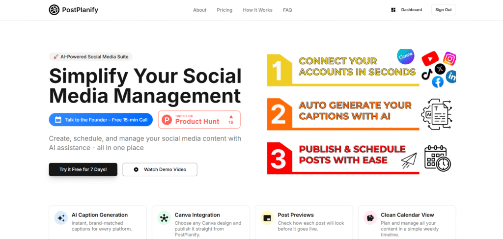 PostPlanify is a helpful tool for scheduling social media posts. The interface is simple and easy to use, making it great for small teams and creators. I liked the AI-generated captions and Canva integration, which saves me time. It has some minor limitations, like a short free trial and no offline use, but overall it works well and makes managing multiple platforms easier.