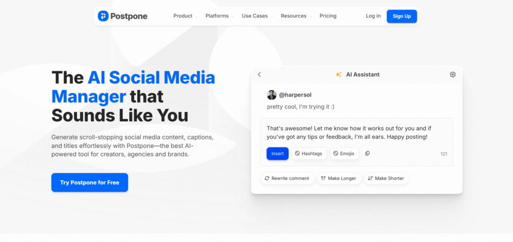 I have used many social media tools before, and after trying Postpone, I think it is a good app but not perfect. It is very easy to schedule posts and the AI assistant is helpful for writing better captions. I like that I can post to many platforms at the same time, and the mobile app works well. But sometimes the app feels a bit slow, especially when using the inbox to reply to comments. Also, some features like detailed analytics and team tools are only in the expensive plans, which may not be good for small creators. Still, Postpone saves me time and makes posting much easier, but I think there is room to make it faster and a little more affordable.