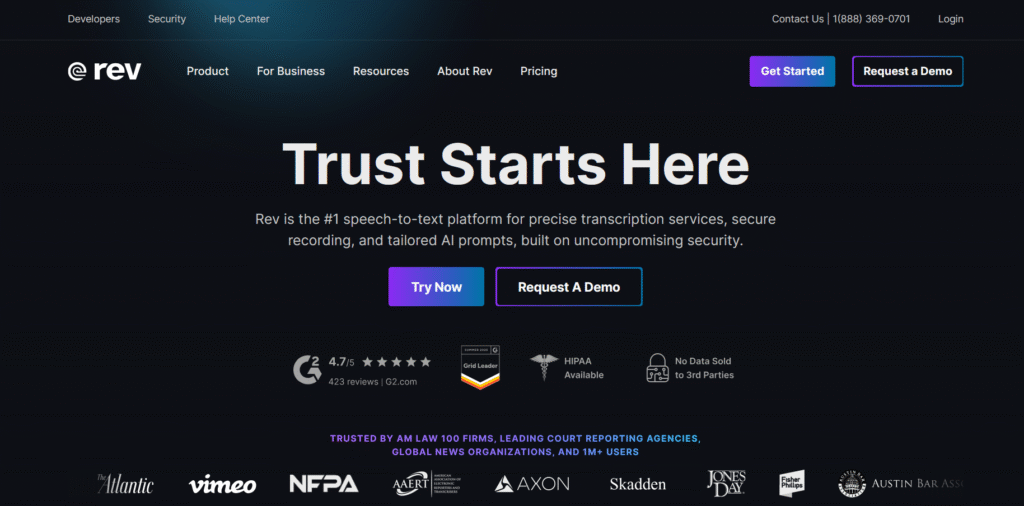 Rev is a powerful speech-to-text platform that helps people turn audio and video into clear, accurate transcripts using both AI and human transcription. It is trusted by top law firms, newsrooms, and over a million users because it offers fast, secure, and easy-to-use tools. With Rev, you can record meetings, interviews, or court sessions, and get timestamped transcripts that are ready for court or publication. It also has smart features like AI templates, which turn long recordings into key summaries, and a mobile app for working on the go. Rev works well with Zoom, Teams, Google Meet, and more, and keeps your data private with HIPAA, GDPR, and SOC2 protections.
