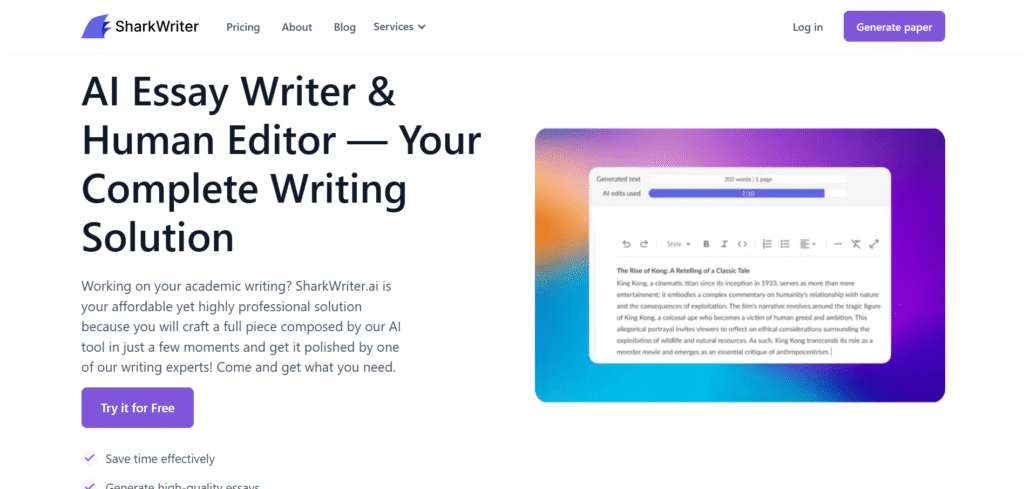 After trying SharkWriter, I think it’s a useful tool but not perfect. It’s fast and easy to use, and the AI can make a clear essay draft in just a few seconds, which really saves time. I like that it also offers human editing because the AI text sometimes sounds a bit robotic or repeats ideas. The citations look nice, but not all of them are accurate, so I had to double-check some sources myself. The free version is okay for short tasks, but if you want better quality, you’ll probably need to pay for human editing. Overall, SharkWriter is helpful for getting ideas or structure, but it’s not something I’d trust for a final paper without checking and fixing things myself.