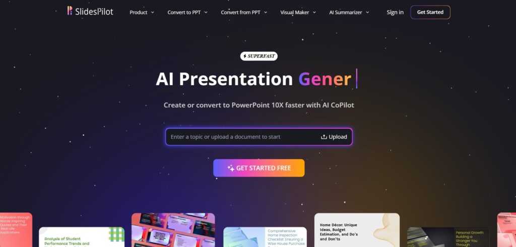 SlidesPilot is a superfast AI tool that helps you make PowerPoint presentations in seconds. You just type a topic or upload a file, and the AI builds your slides for you using beautiful templates. It can turn PDFs, Word docs, YouTube videos, and even webpages into presentations. You don’t have to start from scratch or waste time searching for pictures—AI adds images and summaries for you. There’s also an AI Copilot that can fix grammar, rewrite slides, and create new content on the go. Whether you’re a teacher, student, or business pro, SlidesPilot makes your work faster and easier in many languages.