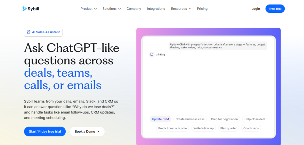 Sybill looks like a strong AI sales assistant that saves time with clear call summaries, searchable transcripts, and handy follow-up email drafts, so you can stay focused in the meeting instead of typing notes. At the same time, it is not perfect: some users say the notes or recaps can be slow to arrive, the email drafts can sound more formal than their normal style, and people still want better ways to clip and share key moments. One independent test also mentions it can be annoying to switch off (it may join meetings when you did not want it to), logging in can take a while, and it may feel limited if you need deep analytics or lots of custom setup. Also, if you want CRM autofill, setup can require an admin and sometimes admin-level CRM permissions, which can slow you down in bigger teams.