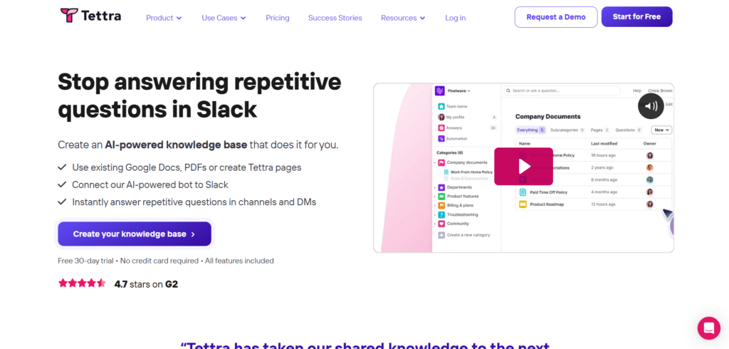 Tettra receives highly positive reviews for its user-friendly interface, easy setup, and seamless Slack integration, making it ideal for team knowledge sharing and onboarding. Users praise fast customer support and constant feature updates, though some note minor bugs and limited customization.