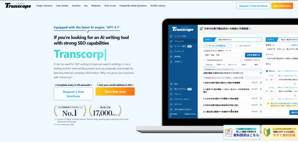 Transcope is an AI writing tool made for SEO and everyday business writing. It runs on GPT-4.1 and can learn your company info, so texts sound on-brand. It studies top competitors and keywords, then writes long, SEO-friendly articles and rewrites, with checks and a simple flow from title to full draft. It also accepts multimodal input (URLs, images, audio, CSV), and includes keyword suggestions and search-ranking research to cut other SEO tool costs. Teams use it for blog posts, proposals, and emails, and it’s trusted by 17,000+ companies (with case studies from big brands). You can start free, then pick a plan when ready. If you want faster content and better rankings, Transcope is a clear, easy-to-use choice.